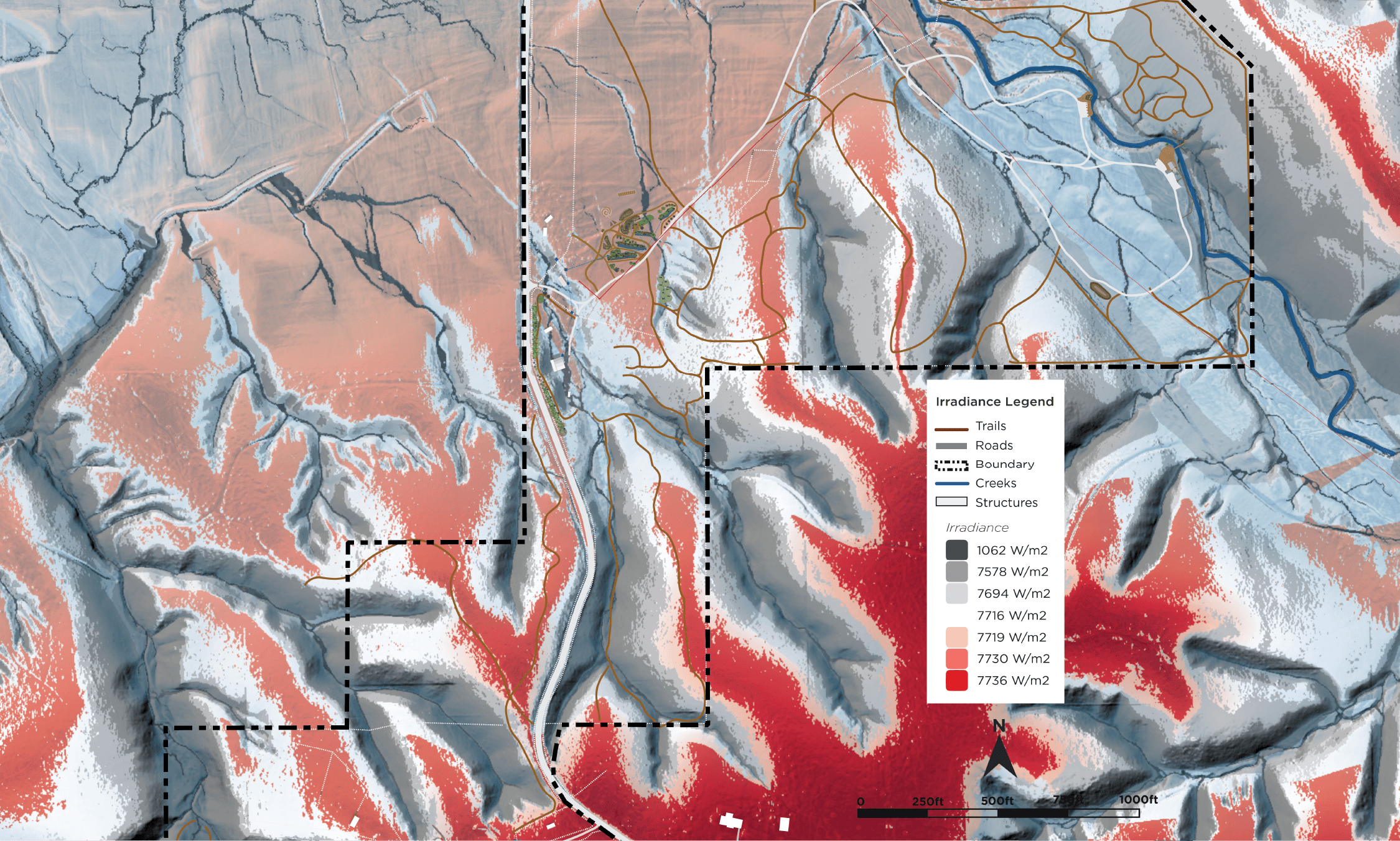 Shows how sunlight is distributed across the landscape over time, identifying areas of high exposure, shade, and seasonal variability.