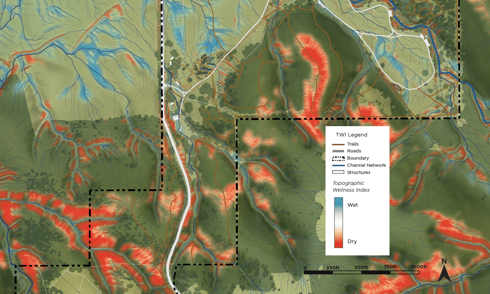Maps how water organizes across the landscape—revealing flow paths, drainage boundaries, and how water concentrates and moves through the site.