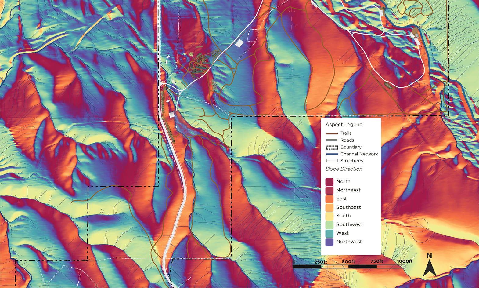 Indicates which direction slopes face, shaping sunlight exposure, temperature, and moisture—key factors for planting and microclimate design.