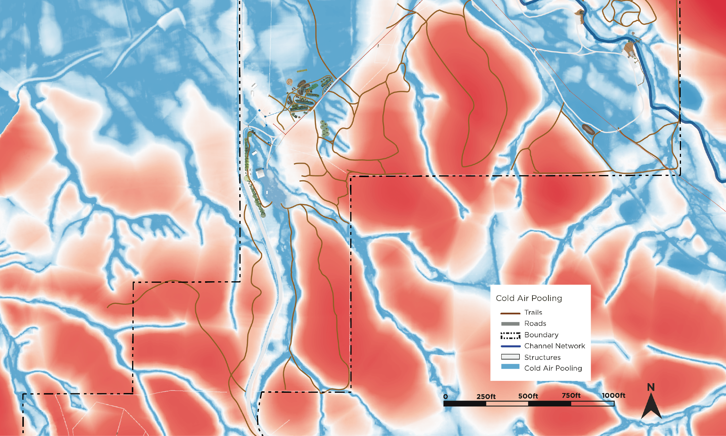Reveals where cold, dense air settles across the landscape—highlighting frost-prone zones and warmer elevated areas.