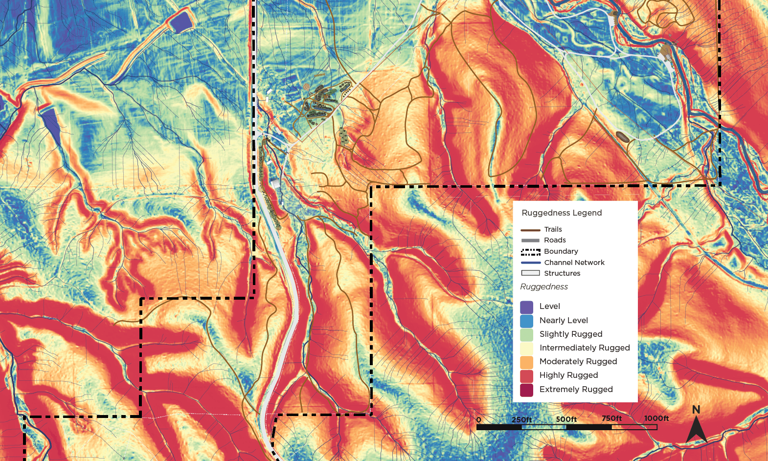 Measures how smooth or complex the landscape is, highlighting areas of stability versus highly irregular terrain. This helps inform access difficulty, infrastructure placement, and areas where ecological complexity may already be high.