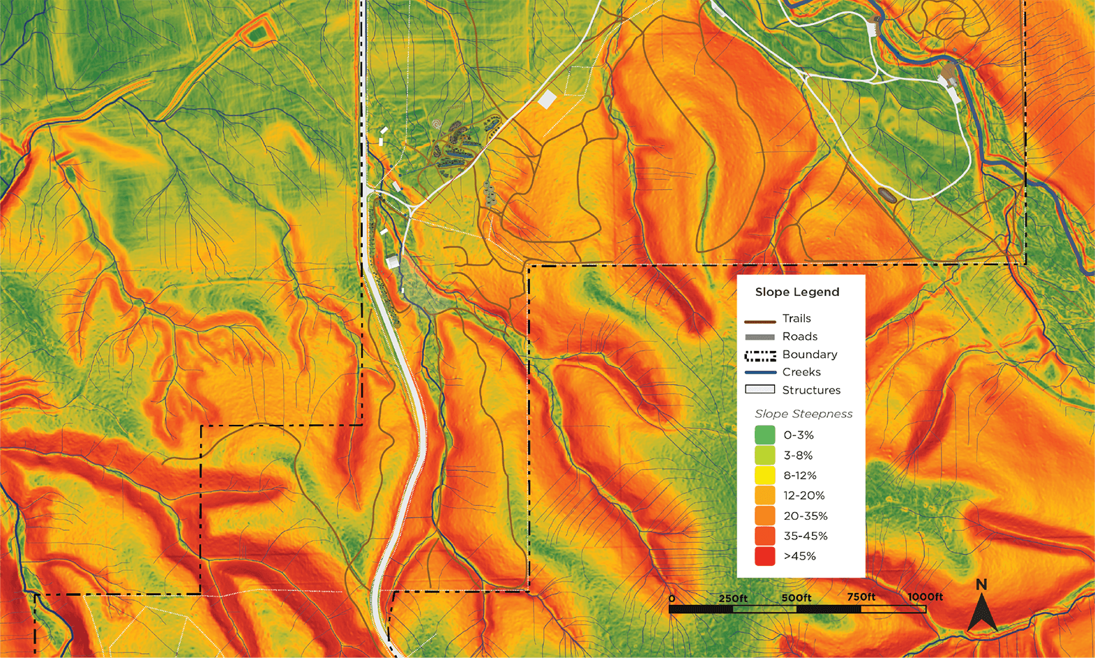 Shows how steep or gradual different areas are, helping identify where access is feasible, where erosion risk increases, and where systems can be placed effectively.