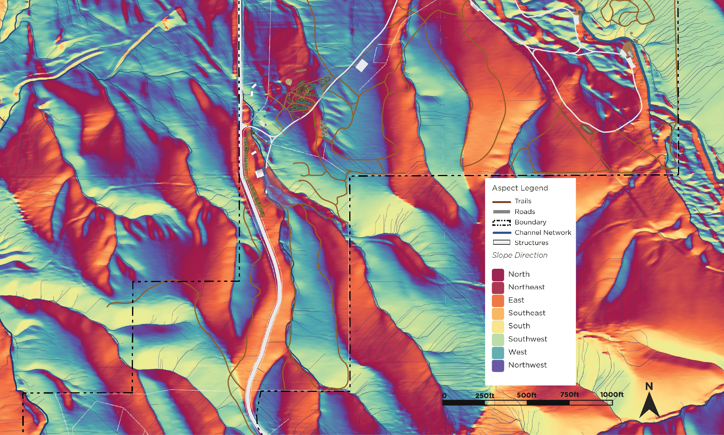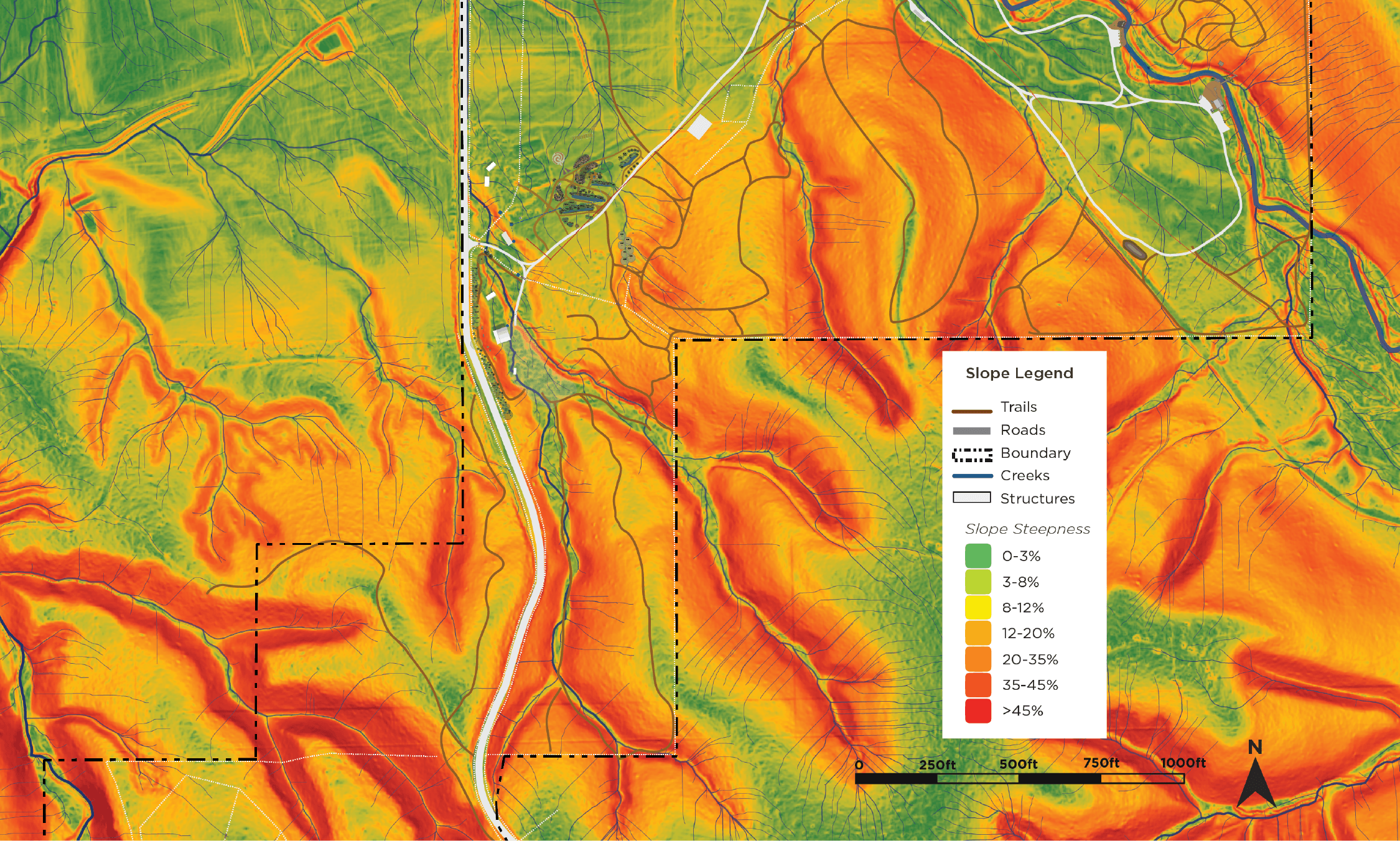Slope maps show how steep or gradual slopes are on the land, helping identify areas suited for access, infrastructure, or leaving forested. By matching land use to slope, we reduce erosion risk and hazards, optimize access, and place systems where they can function efficiently and sustainably.