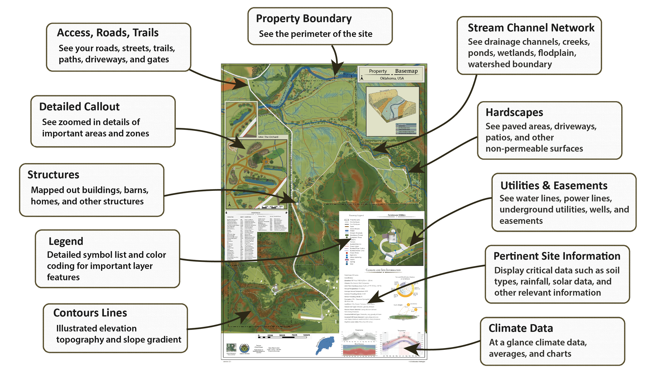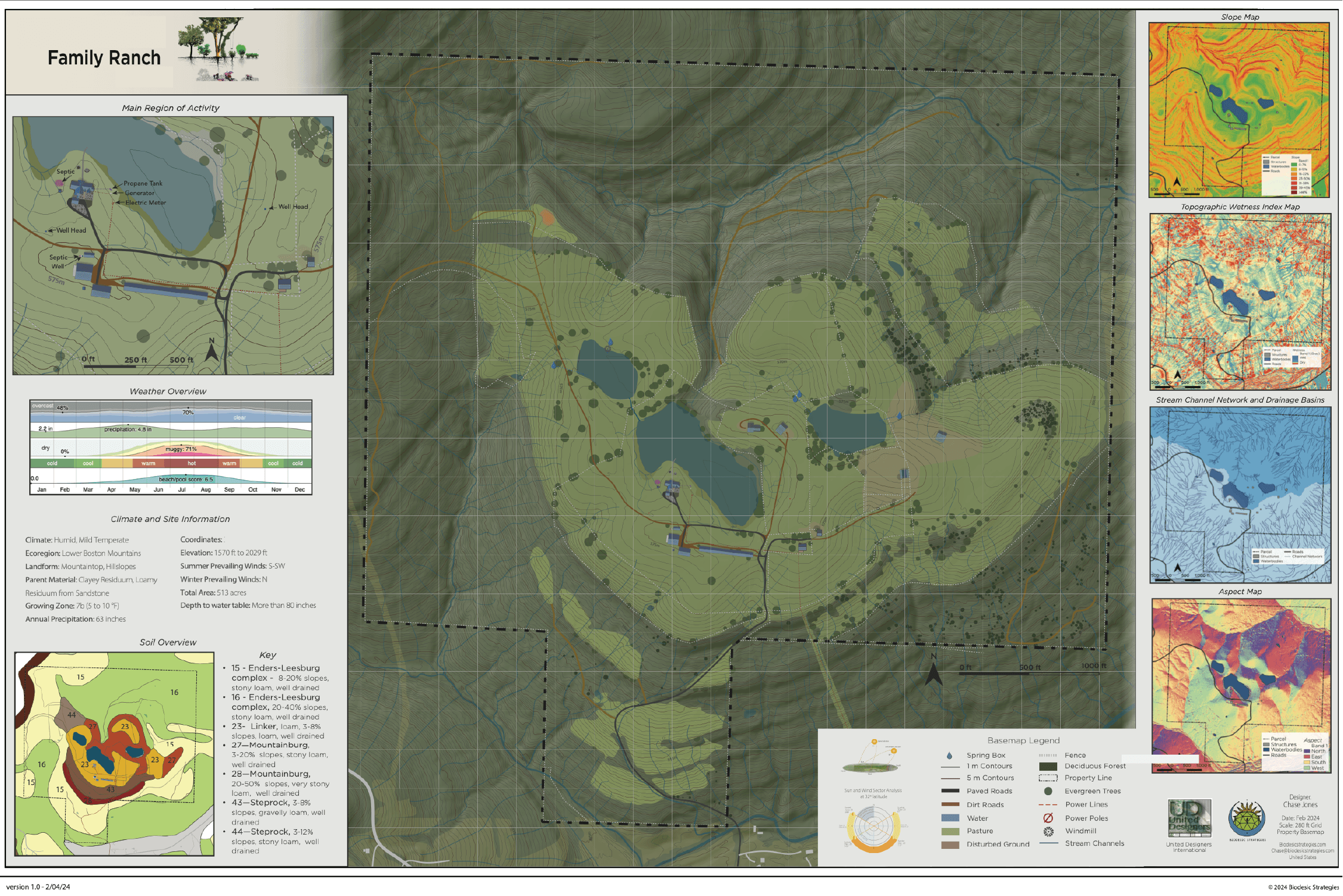 Gain a detailed understanding of your land with a basemap that incorporates all critical elements of ecology and infrastructure to inform regenerative design