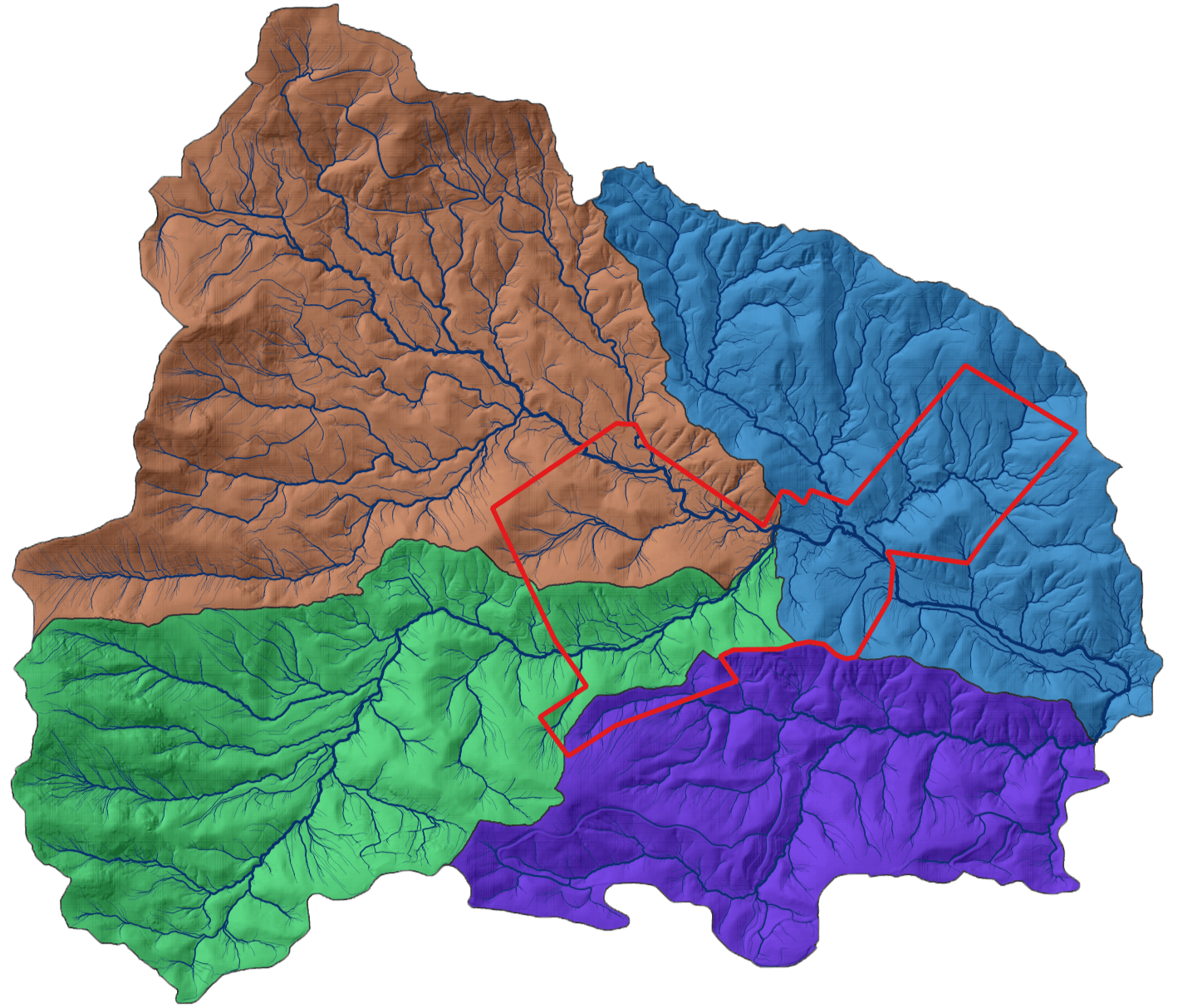 A larger, forested landscape with varied elevation and watershed influences across the site.