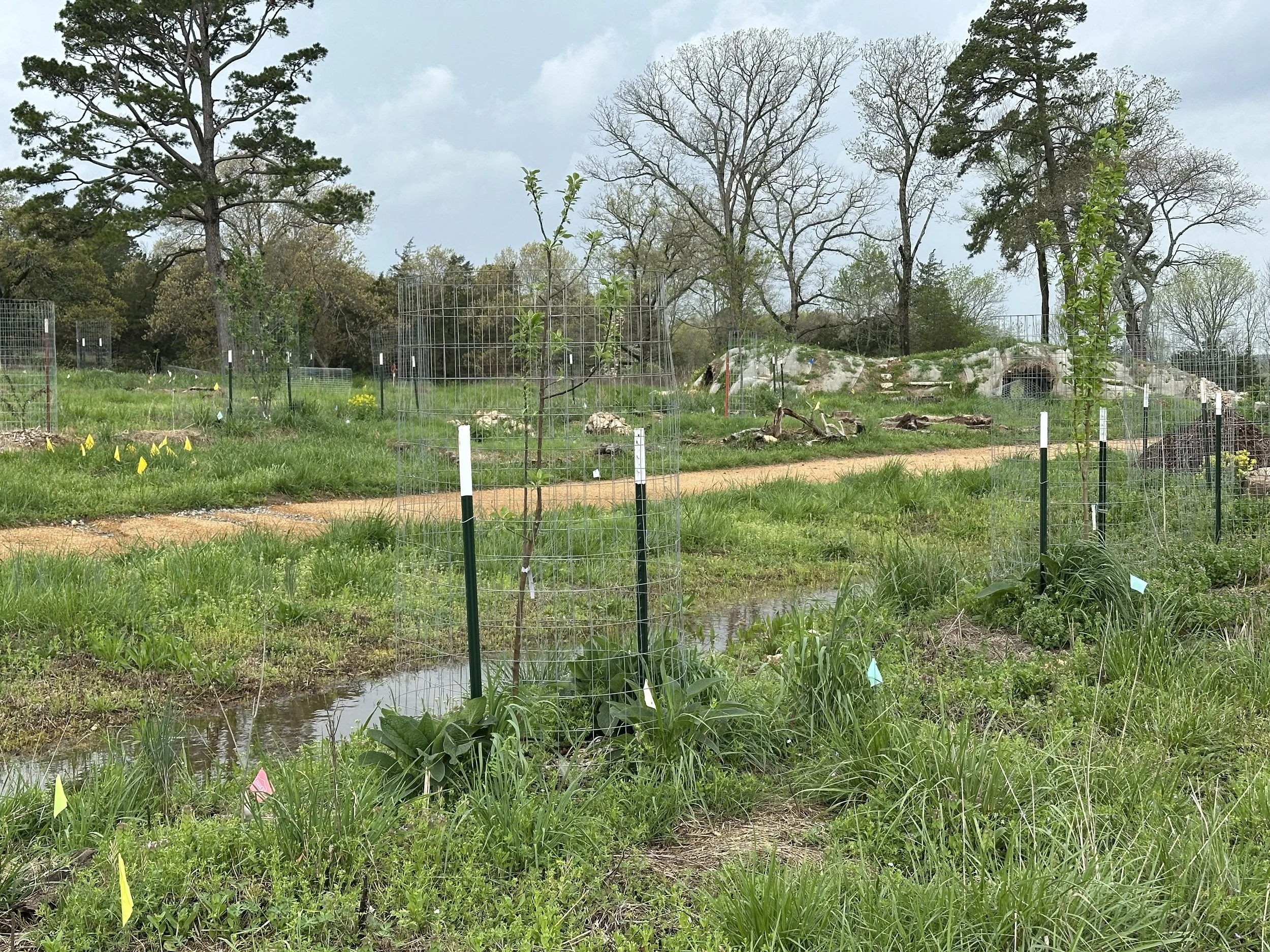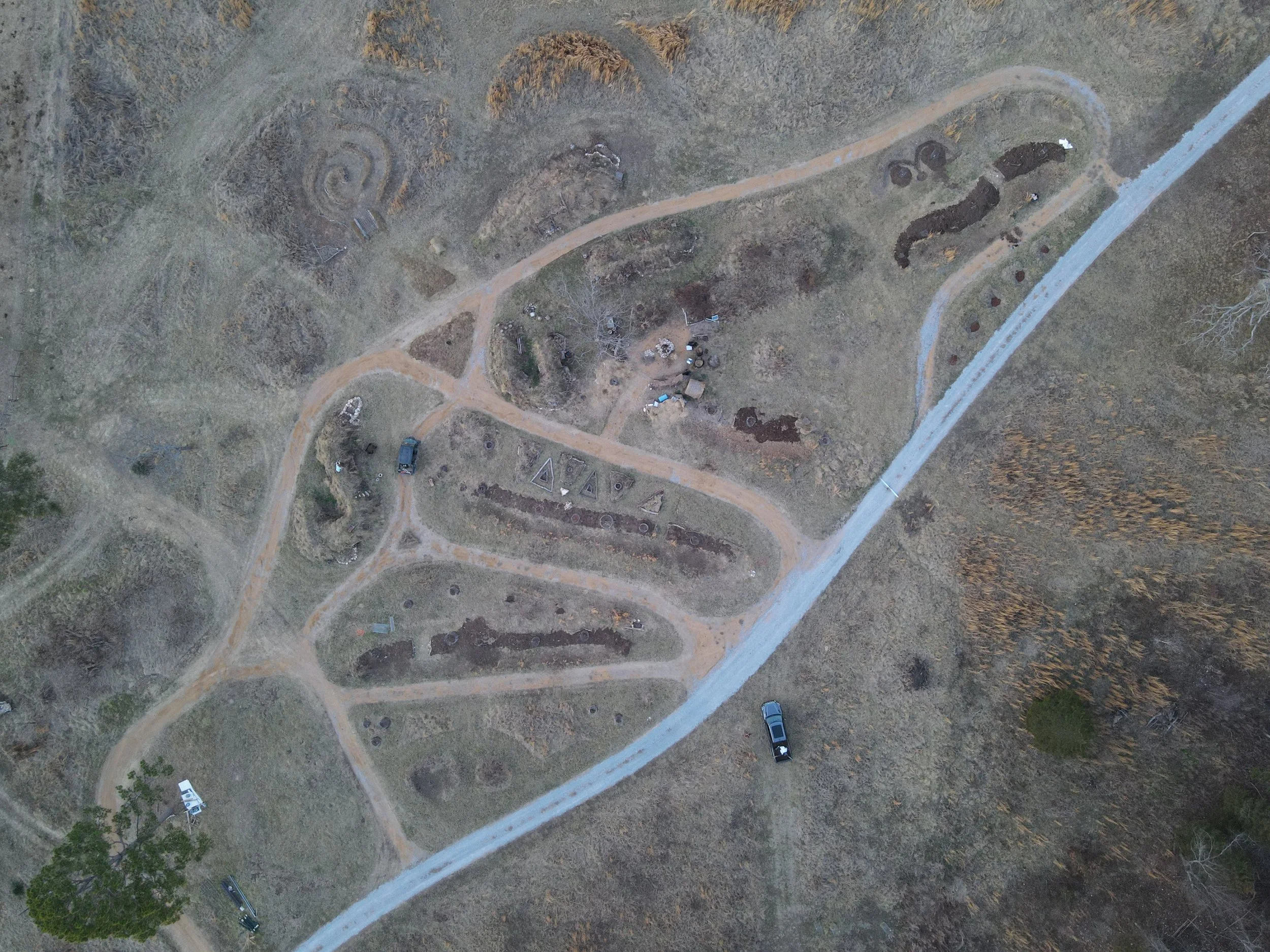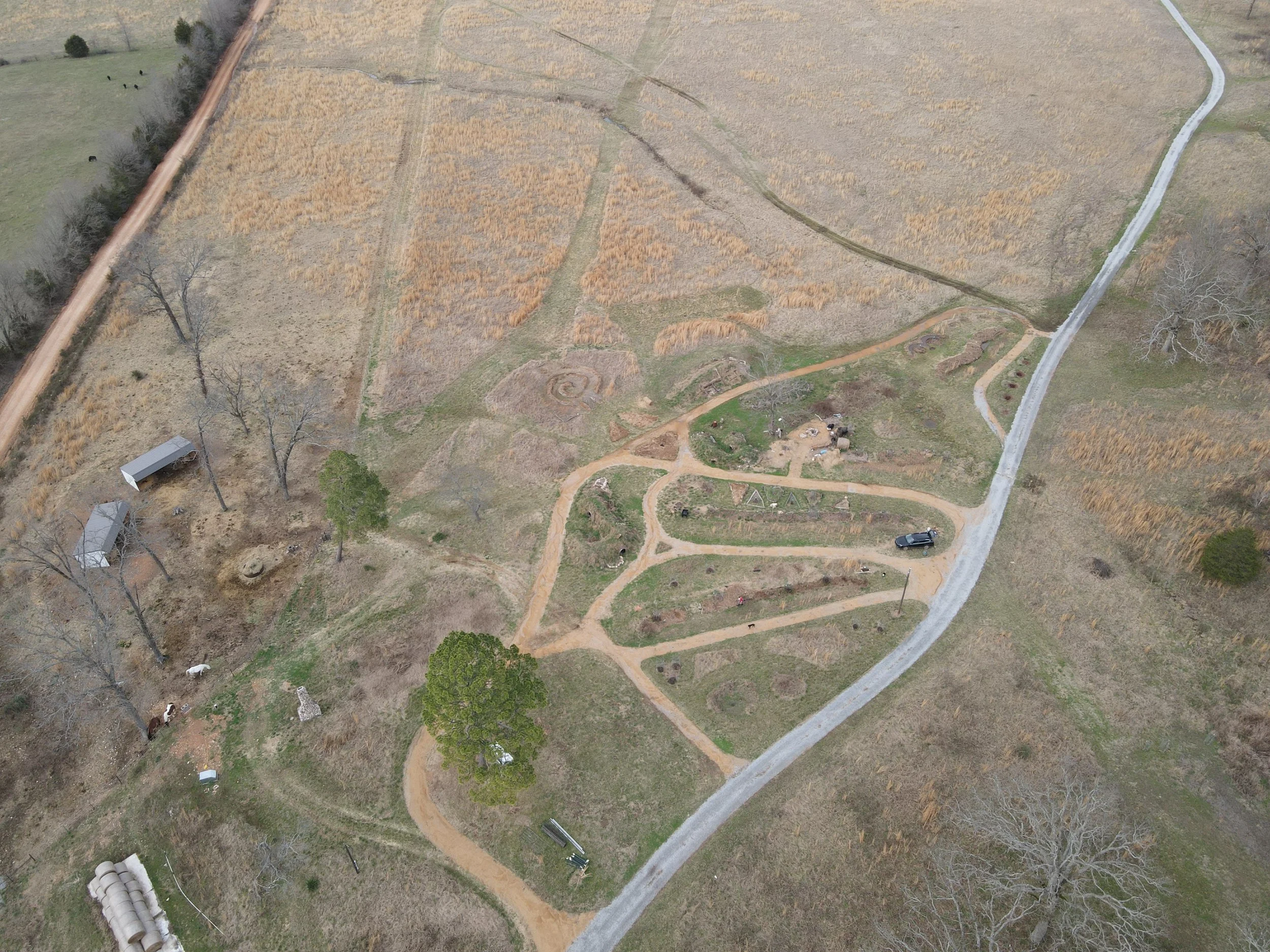 Explore a food forest in Northeastern Oklahoma. The project uses earthworks in the form of swales and rain gardens, and drip irrigation for the hydrological backbone. Soil restoration is taking place as we use cover crops, nitrogen fixers, compost and liquid biological amendments to reverse 80 years of conventional land management. Biome specific cultivars and nurse plants were used to improve resilience of the system. We also installed several large hugelkultur mounds which add texture, edge, and microclimates to the site. A central courtyard with wild flowers, bee hives and a bee bubbler help support the pollinators that support our crops.
