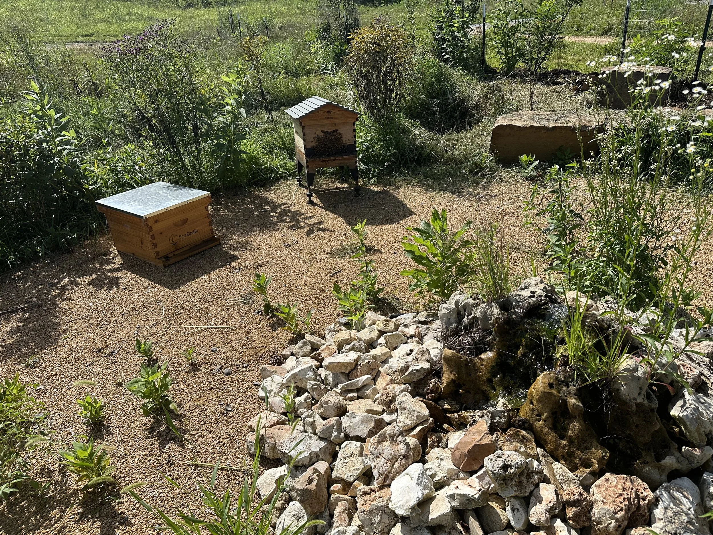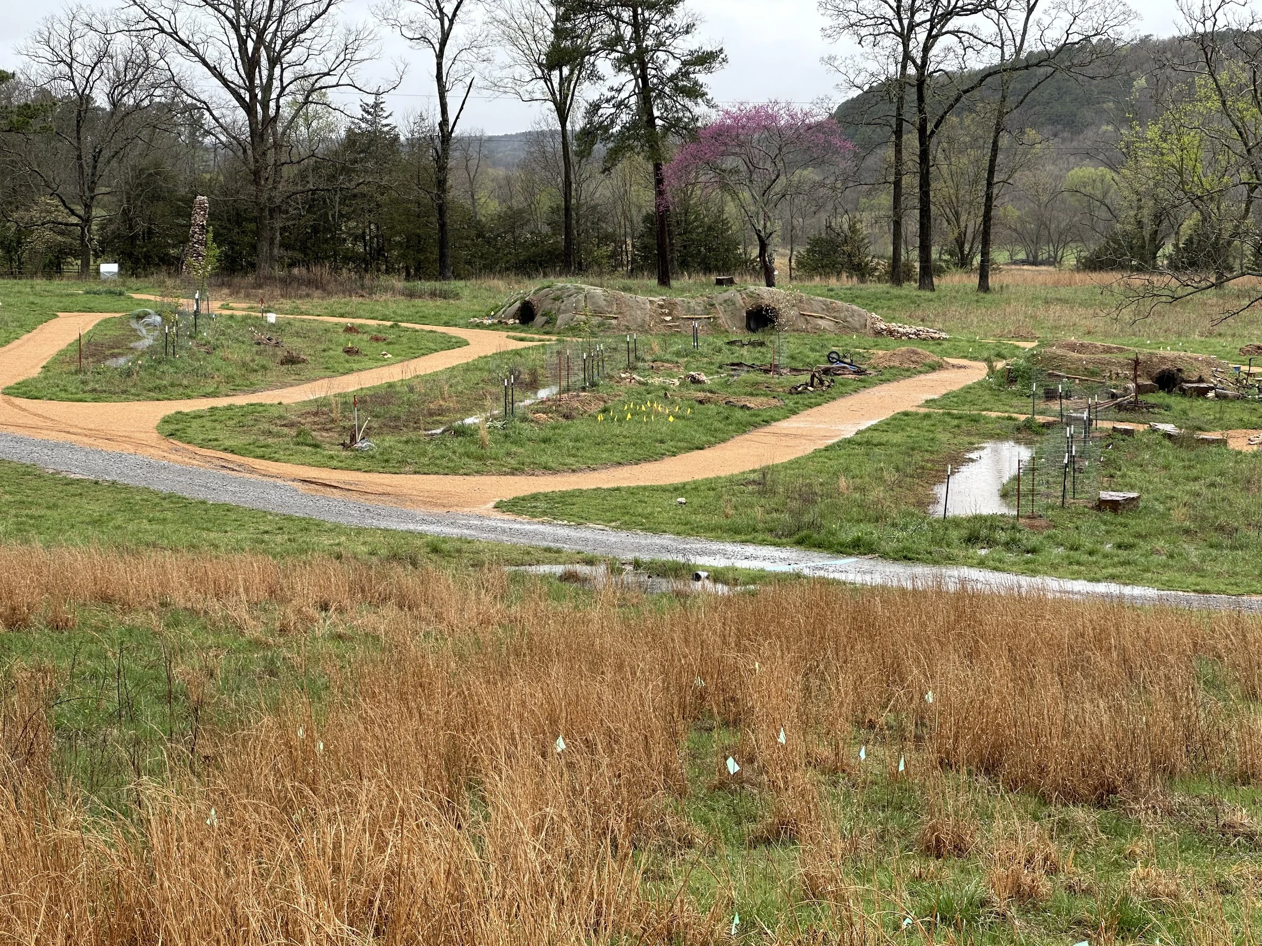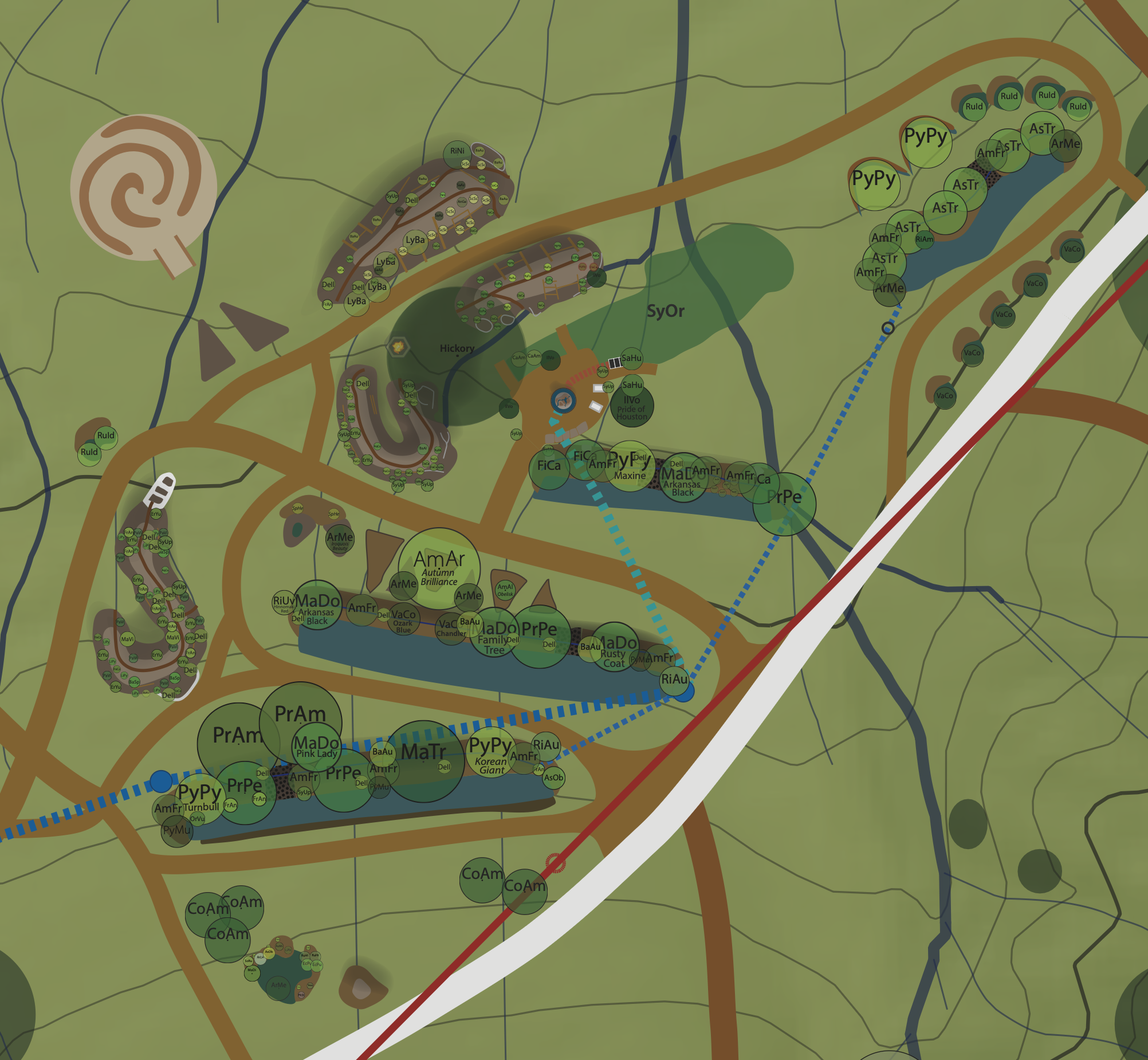 Explore a food forest in Northeastern Oklahoma. The project uses earthworks in the form of swales and rain gardens, and drip irrigation for the hydrological backbone. Soil restoration is taking place as we use cover crops, nitrogen fixers, compost and liquid biological amendments to reverse 80 years of conventional land management. Biome specific cultivars and nurse plants were used to improve resilience of the system. We also installed several large hugelkultur mounds which add texture, edge, and microclimates to the site. A central courtyard with wild flowers, bee hives and a bee bubbler help support the pollinators that support our crops.